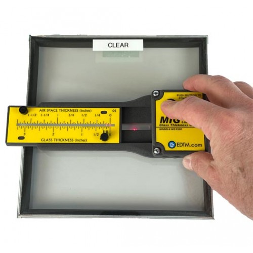 The "MIG" Laser Glass Thickness Gauge is a durable tool for measuring glass and air space thickness in sealed insulating glass units. Laser reflections off the glass surfaces appear on the gauge's graduated scale. These reflections allow you to easily determine the thickness of the glass and the air space separating the pieces of glass in a sealed IG assembly. The measurements are taken from a single side of the IG unit, and no additional tools are necessary.